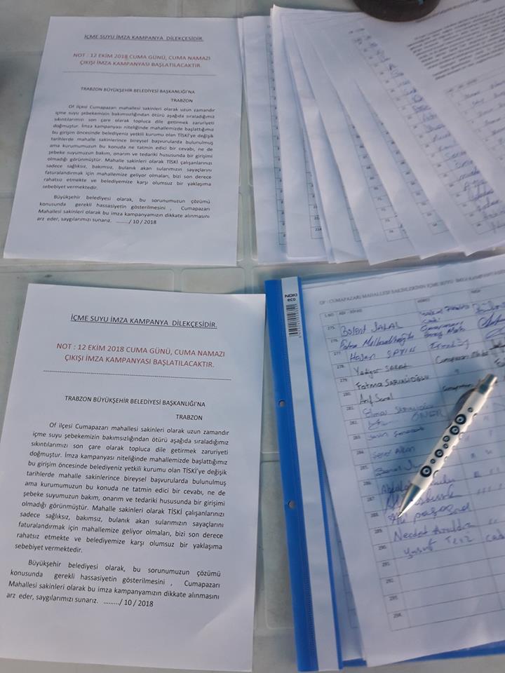 Platformumuz adına daha önce duyurusunu yaptığımız ve 12/10/2018 Cuma günü başlattığımız Cumapazarı şebeke suyunun bakım, onarım ve tadilatıyla alakalı imza kampanyamız 16/10/2018 Çarşamba günü sona ermiş ve 19/10/2018 tarihi itibarı ile yani bu gün saat 14:00 de toplam 434 imza ile Trabzon Büyükşehir belediyesine 10131 kayıt numarasıyla dilekçemizi verdik.