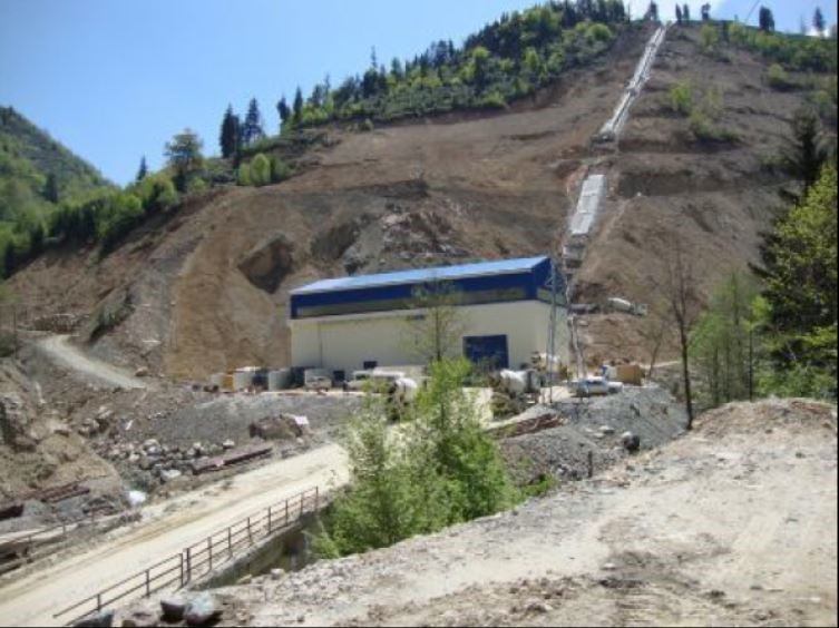 Murgul’un Kabaca Deresi üzerinde yapılan çoklu HES’lerden birine ait cebri boru hattı ve santral yapısı(Özalp, Kurdoğlu, Yüksel, Yıldırımer, 2010).