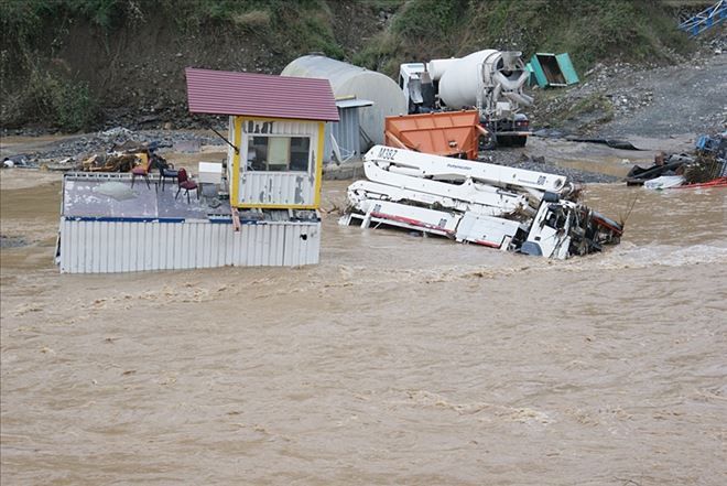 Çaykara ve Dernekpazarı ilçelerinde 2 gün boyunca aralıksız yağan yağmur sonucu taşan Solaklı Deresi, Of-Çaykara Karayolu 5´nci kilometresi, Dumlusu Mahallesi Mevkii´ndeki, Solaklı Deresi yatağında faaliyet gösteren özel bir şirkete ait Hazır beton ve mucur tesisleri ve tesislere ait araçlar sular altında kaldı.